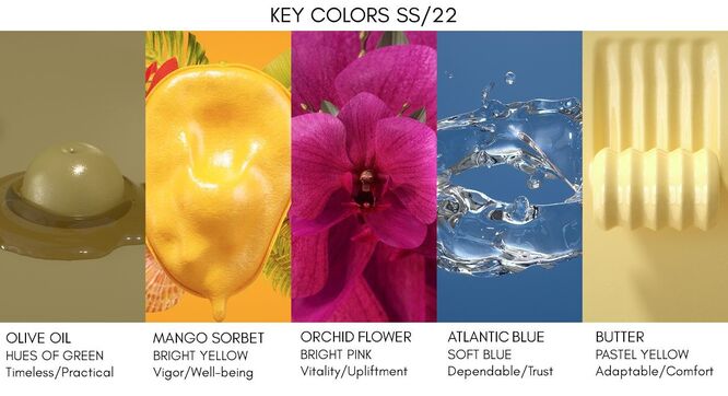 Butter (Pastel Yellow), Atlantic Blue & Olive Green being the other three colors will provide a counter balance to Orchid Pink & Mango Sorbet thereby opening the range to more sober and elevated appeal.
